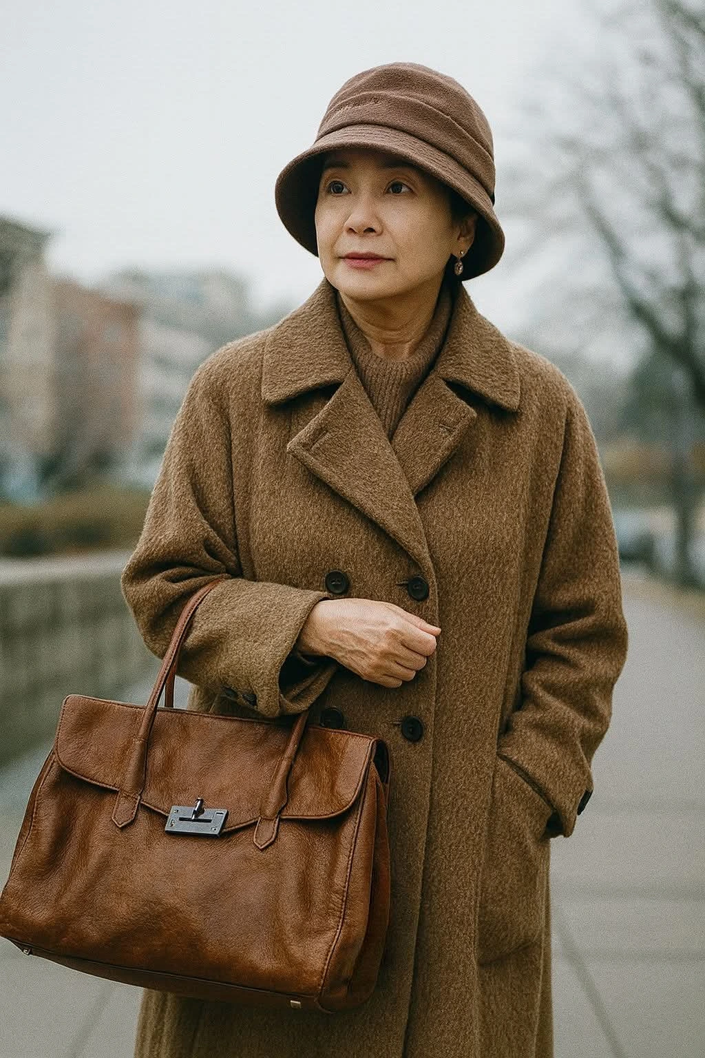 그녀는 코트를 걸쳐입고 겨울용 팰트 버킷 모자를 쓴 뒤 가방을 챙겨 든 채 집을 나섰다. 역시 오래된 가죽 가방 한쪽에서는
