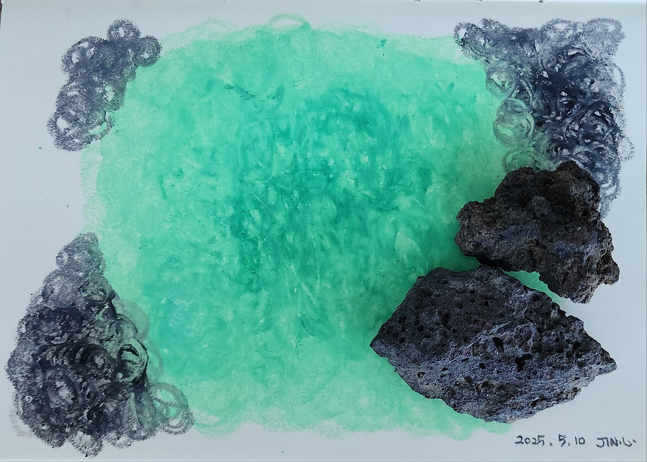 아쉬운 마음에 나의 노트에 제주의 에메랄드 빛 바다를 담아본다.