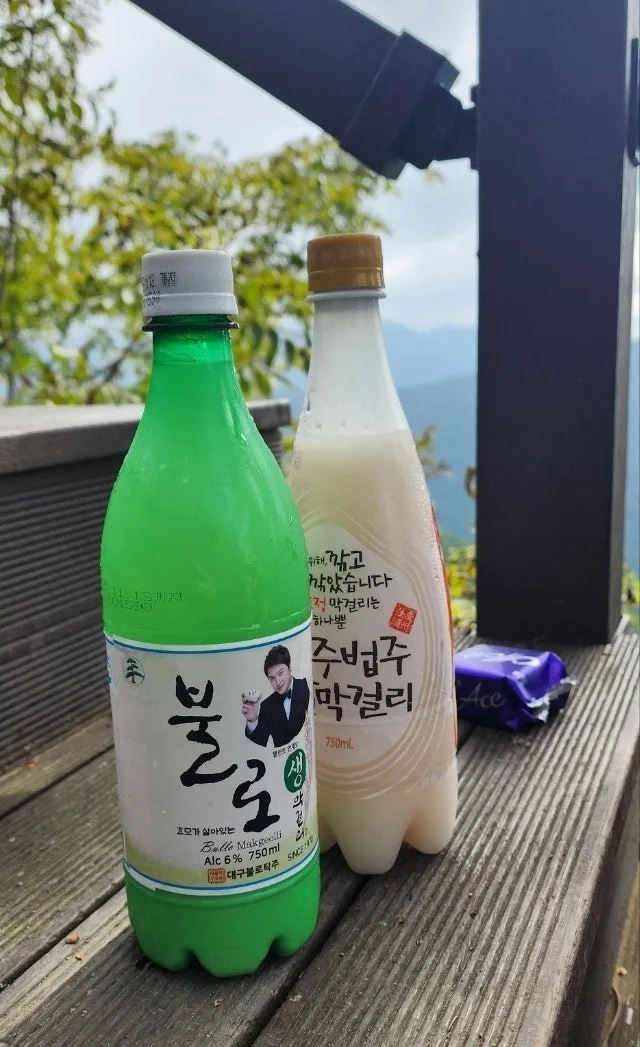 정상에서 잠시 기쁨을 만끽하고, 그늘 찾아 자리 잡고는 가방 속에서 짜잔 등장한 막걸리! 등린이 시원한 막걸리 먹여주려고 밤새 냉동실에서 꽁꽁 얼린 막걸리라는군요. 막걸리 슬러쉬라는 표현이 맞겠어요. 지친 몸과 맘을 시원하게 달래주는 막걸리였어요. 이 맛에 산에 오르는 걸까요?
