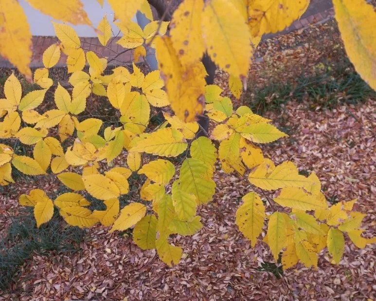 길가의 노란 나뭇잎 사진을 찍는다.