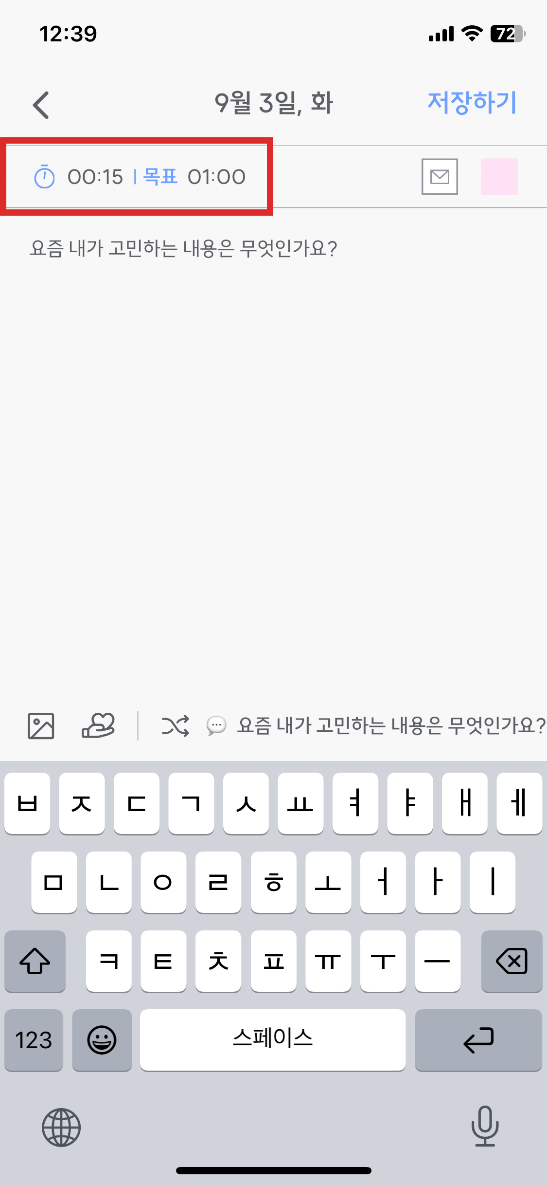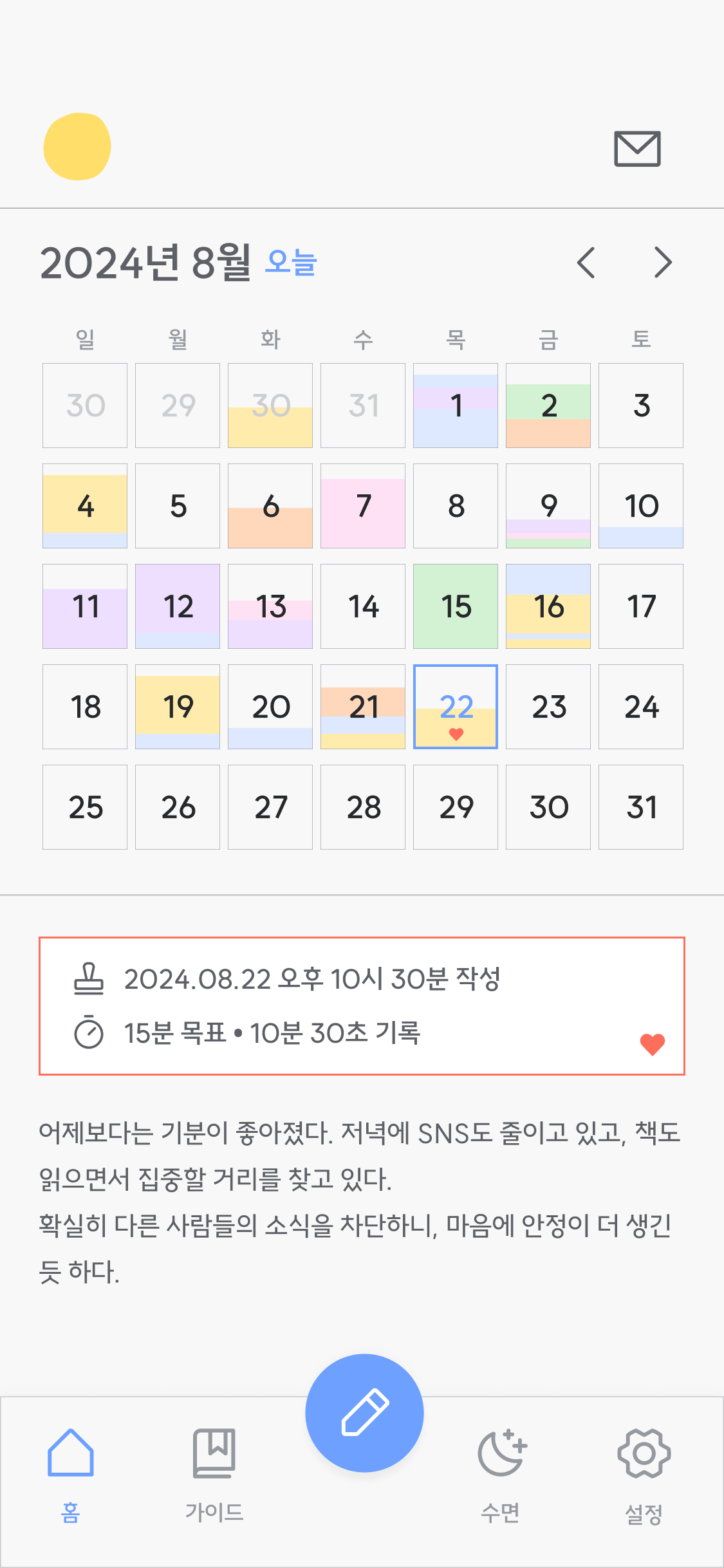 또한, 일기 쓰기는 마음을 먹기가 쉽지 않은 일이라고 생각해요. 그래서 어렵게 마음을 먹고 일기를 작성할 때, 집중을 방해하는 요소가 많으면 오히려 사용 경험이 깨질 수 있다고 느꼈어요. 그래서 단 5분이라도 일기를 쓰는 순간, 최대한 집중할 수 있는 UX를 만드는 데 특히 신경을 썼습니다. 구체적으로는 목표 시간을 설정해 두고, 일기 작성화면 상단에 타이머가 움직이는 것을 볼 수 있는데요. 많은 유저분들이 이 타이머 기능 덕에 짧은 시간이라도 집중할 수 있었다고 피드백을 주시기도 했어요.