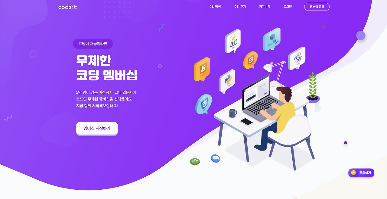 브랜딩 할 때 컬러에 신경을 많이 쓰는 편이어서, 코드잇의 컬러 시스템에 신경을 많이 썼어요. 보라색을 메인 컬러로 내세우게 된 이유는 보라색이 ‘유니크한, 가능성’ 의미를 가지고 있거든요. 또한 코딩할 때 에디터 화면에 블랙 백그라운드에 비비드한 색깔로 하이라이트 되어 있는 글자들이 인상에 남았어요. 여기서 착안해서 서브 컬러 및 포인트 컬러를 선정했어요. 서브컬러는 보라색의 보색인 노란색을 주로 사용하게 되는 것 같아요.