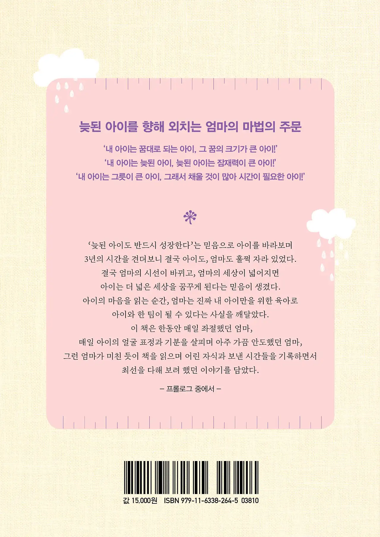 매 순간이 고비였고 한 고개, 한 고개를 넘을 때마다 숨이 차올라 다음 고개는 보이지도 않았던 엄마가 늦된 아이로 몸보다 마음이 먼저 쓰러져 힘든 엄마들에게, 속도보다는 여유를 갖자고, 늦된 아이도 반드시 성장한다고, 위안과 공감, 응원을 보낸다.