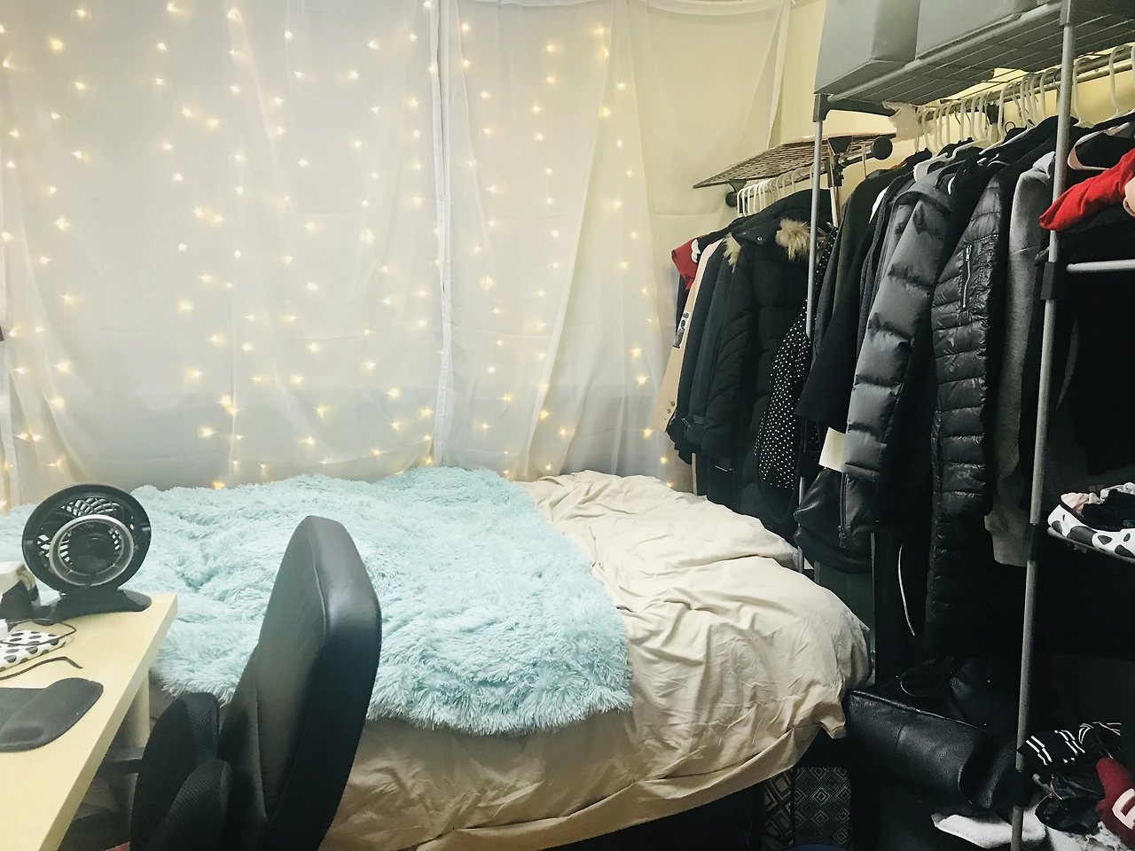 저는 뉴욕에 있을 때 정말 작은방에 살았어요. 뉴욕은 집값이 비싸서 말도 안 되는 열악한 환경에서 살게 되는 경우가 많은데요. 거실 방이라고 해서 방이 아니라 거실에 방처럼 커튼을 쳐서 만든 방에 살았어요.