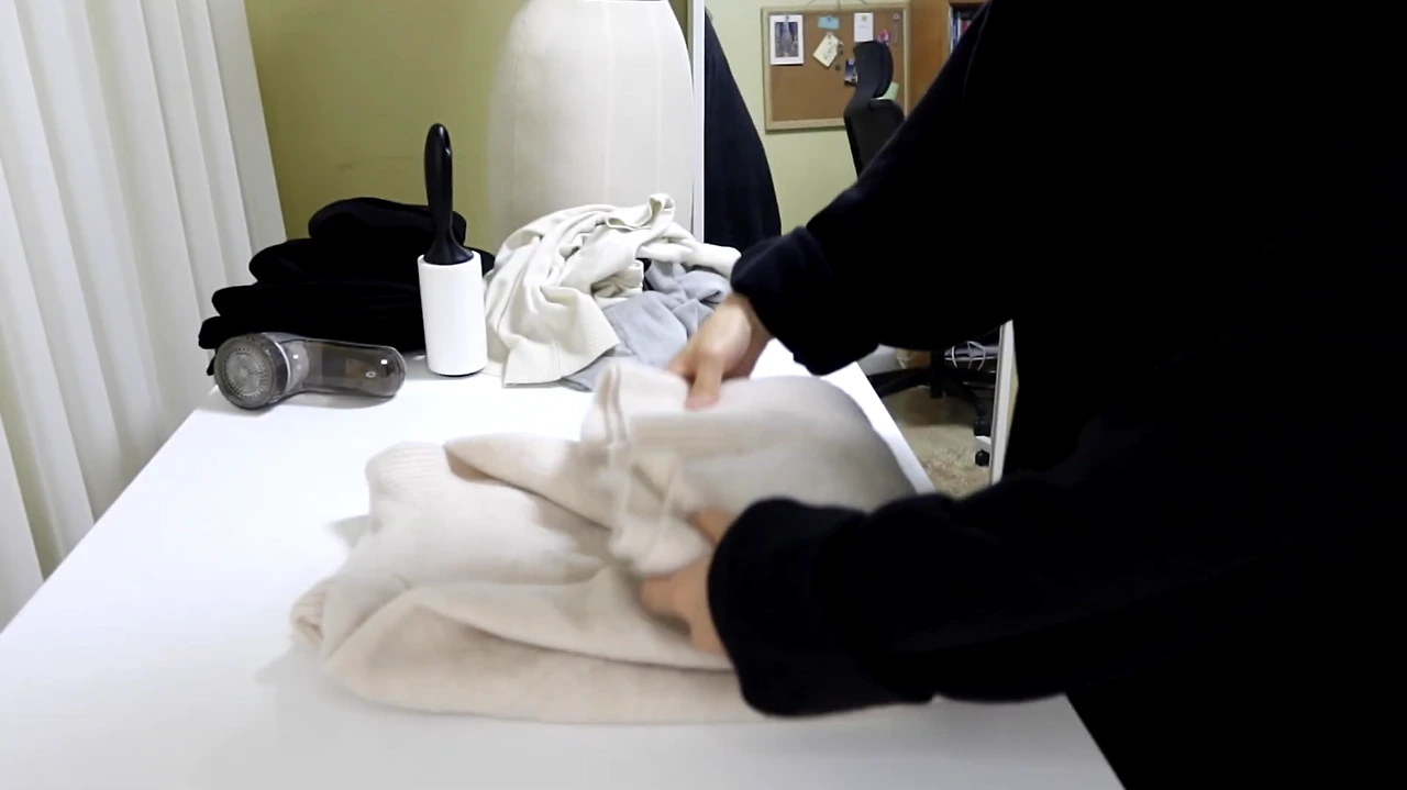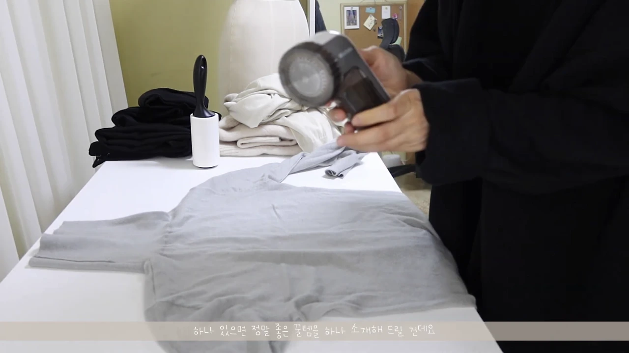 옷감을 확 먹지 않도록, 판판한 데에다가 받침에 대고 보풀 제거를 해 주시면 그런 일이 생기지 않을 수 있으니까 참고해 주세요.