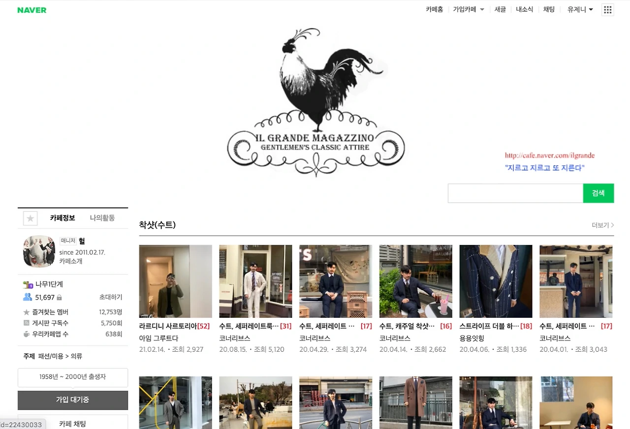 처음에는 디시인사이드 백화점 갤러리 회원들이 개인 중고제품을 판매하기 위해서 만든 카페였대요. 그러다 클래식한 정장을 선호하는 카페로 변했고요.