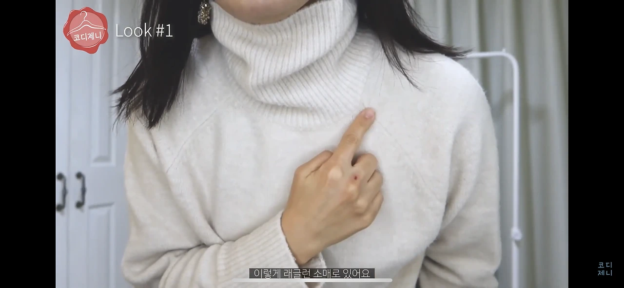 저처럼 턱에 각이 있는 사람들은 목폴라티를 반듯하게 반으로 접어서 입으면 턱 부분이 부각될 수 있어요. 그래서 저는 목 부분을 모두 펴서 흘러내리게 입는 편이에요.