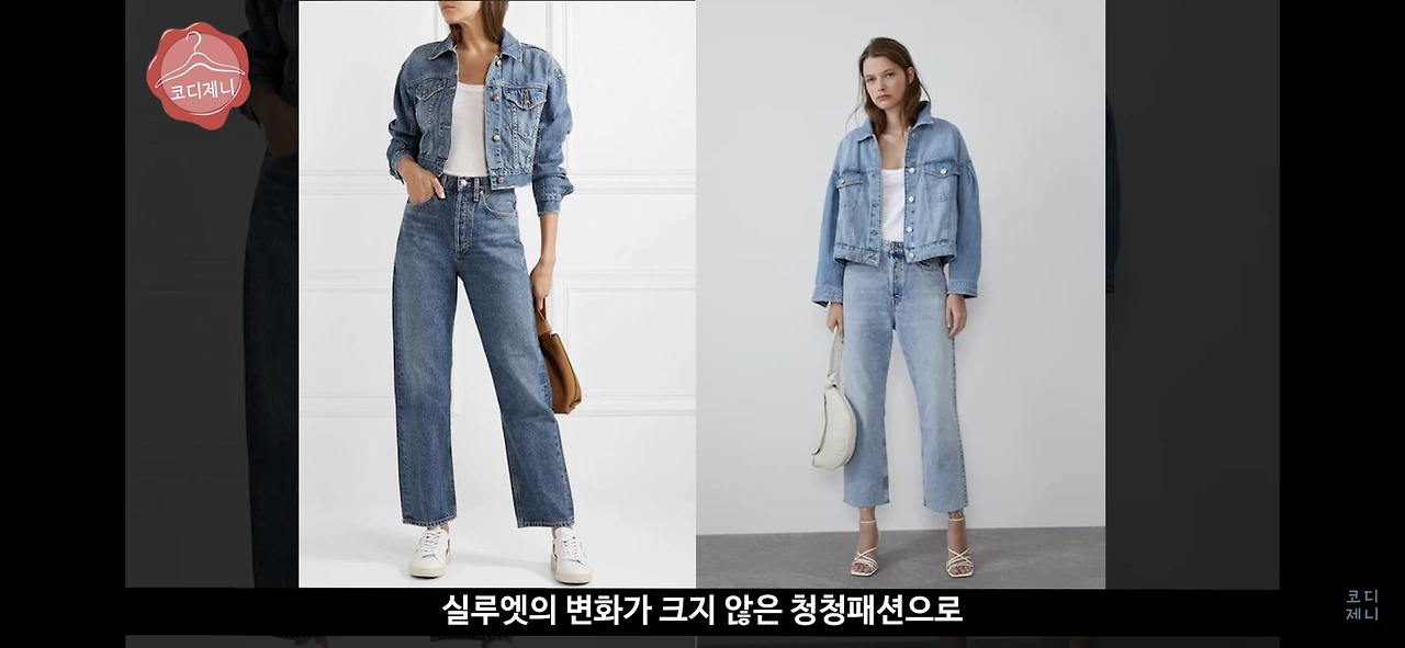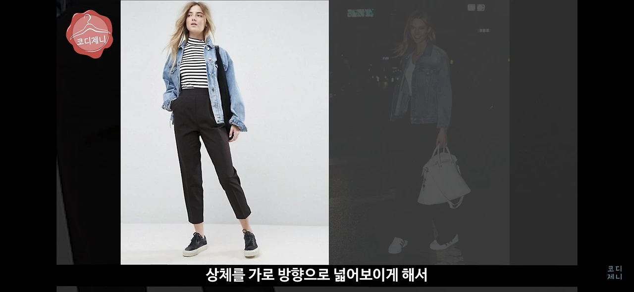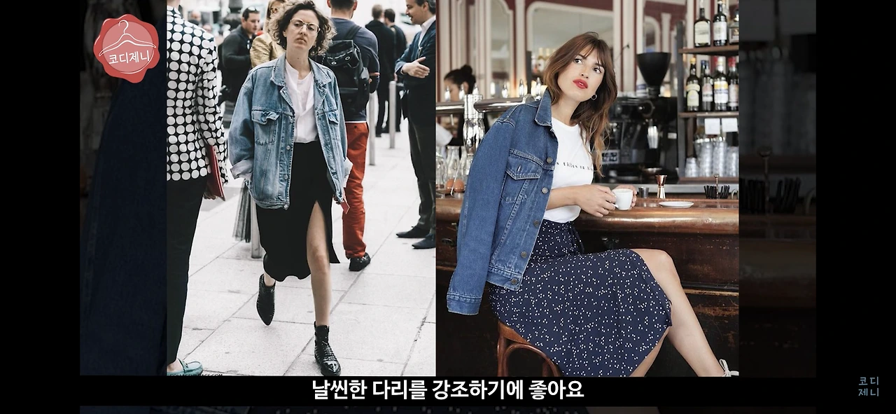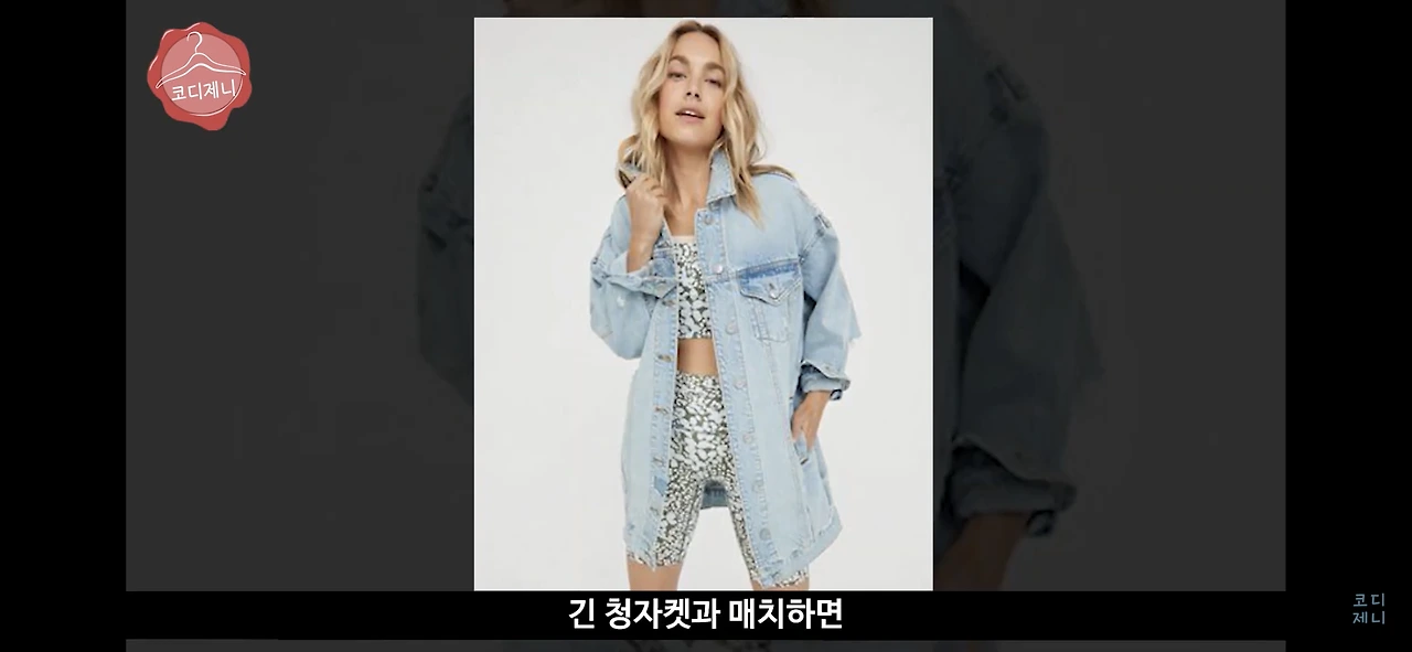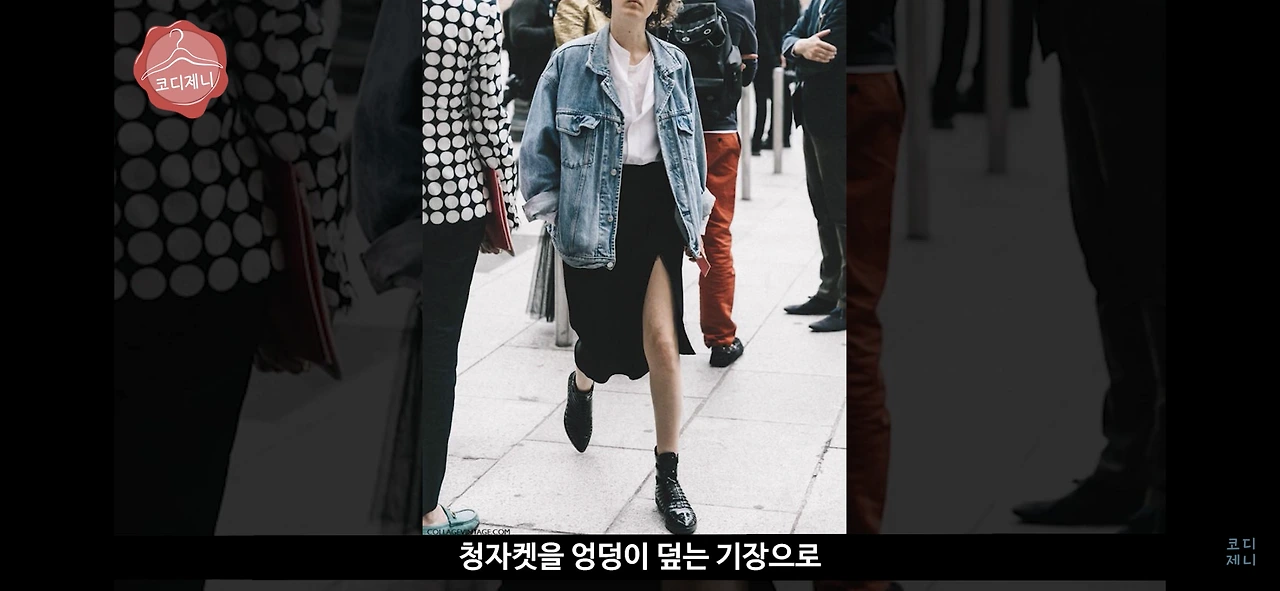 다만 골반라인이 너무 부담스럽거나 허리가 길어서 다리가 짧아보일 수 있는 경우에는 청자켓을 엉덩이 덮는 기장으로 길게 입는 방법도 있어요