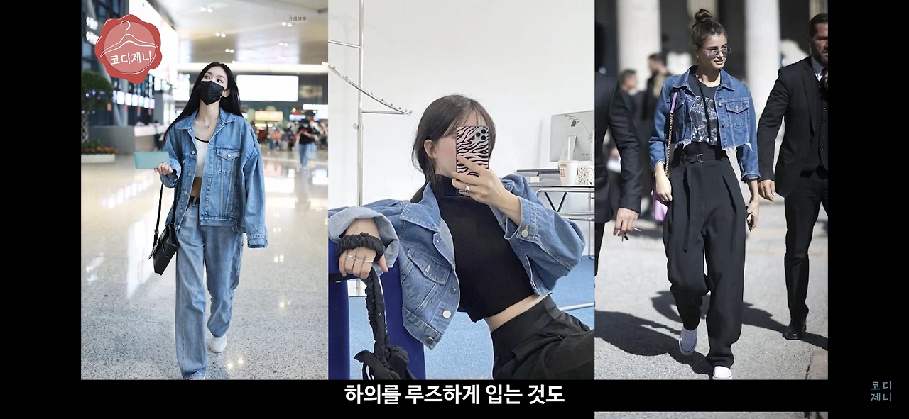 전체적으로 붙게 입고 긴 청자켓과 매치하면 힙하면서도 섹시하게 보일 수 있고