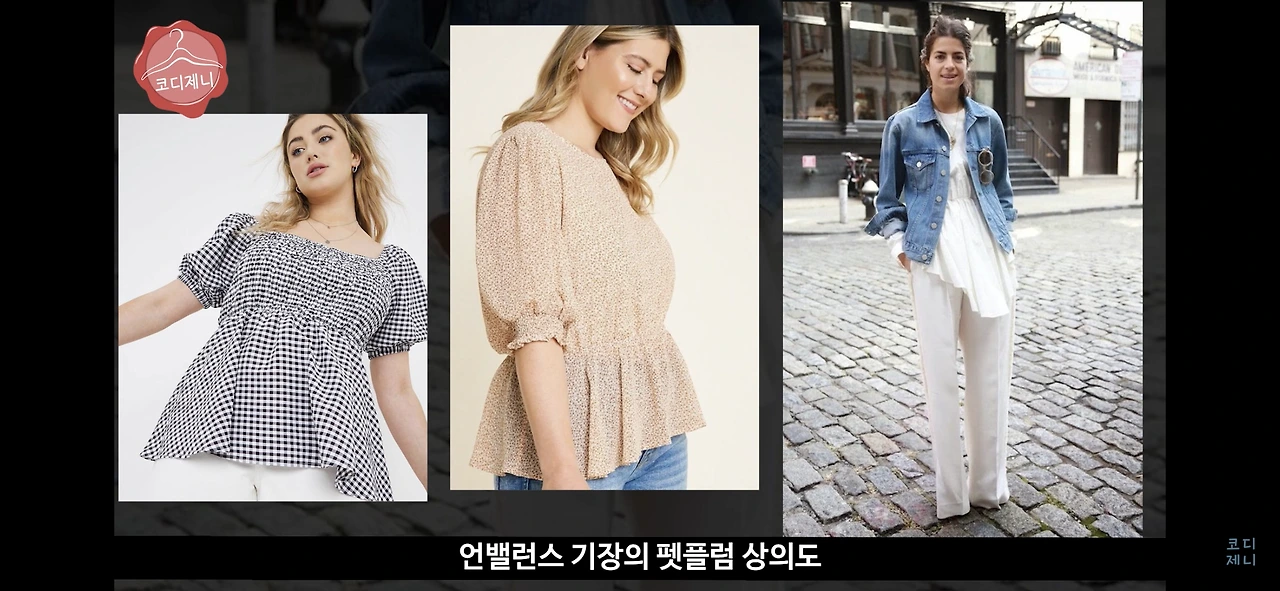 아랫배를 커버하고 다리를 길어보이게 하는 언밸런스 기장의 펫플럼 상의도 통통한 체형에 아주 좋습니다