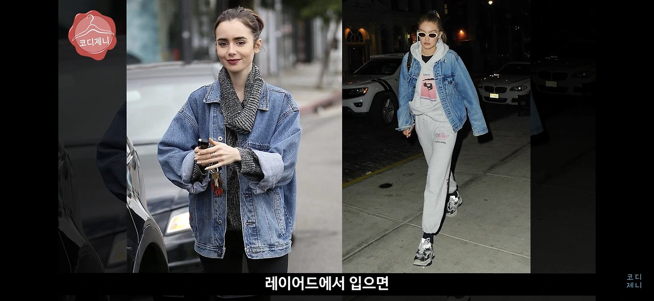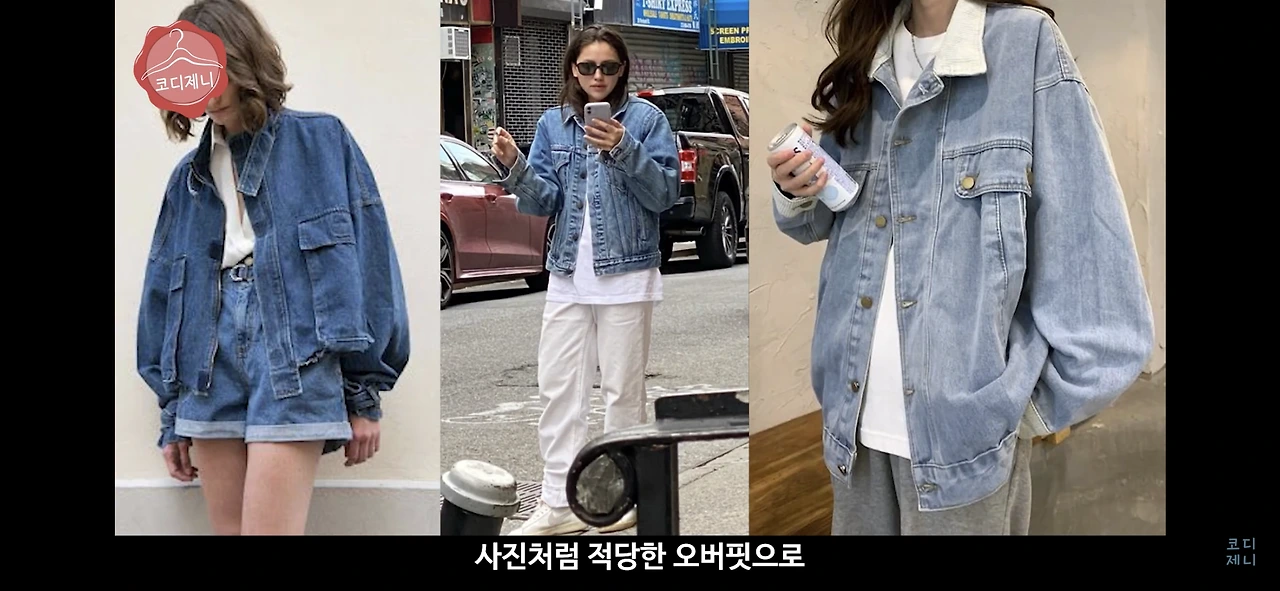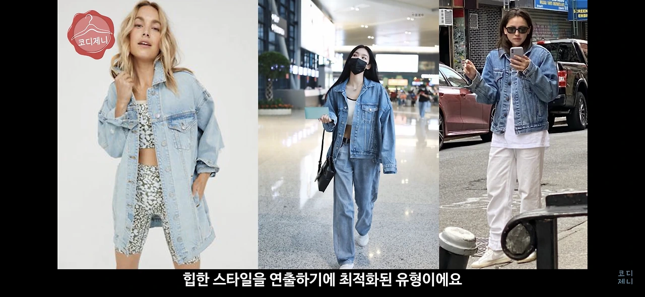 핏이 어벙벙한데 가로 방향의 디테일이 많은 스타일의 데님자켓