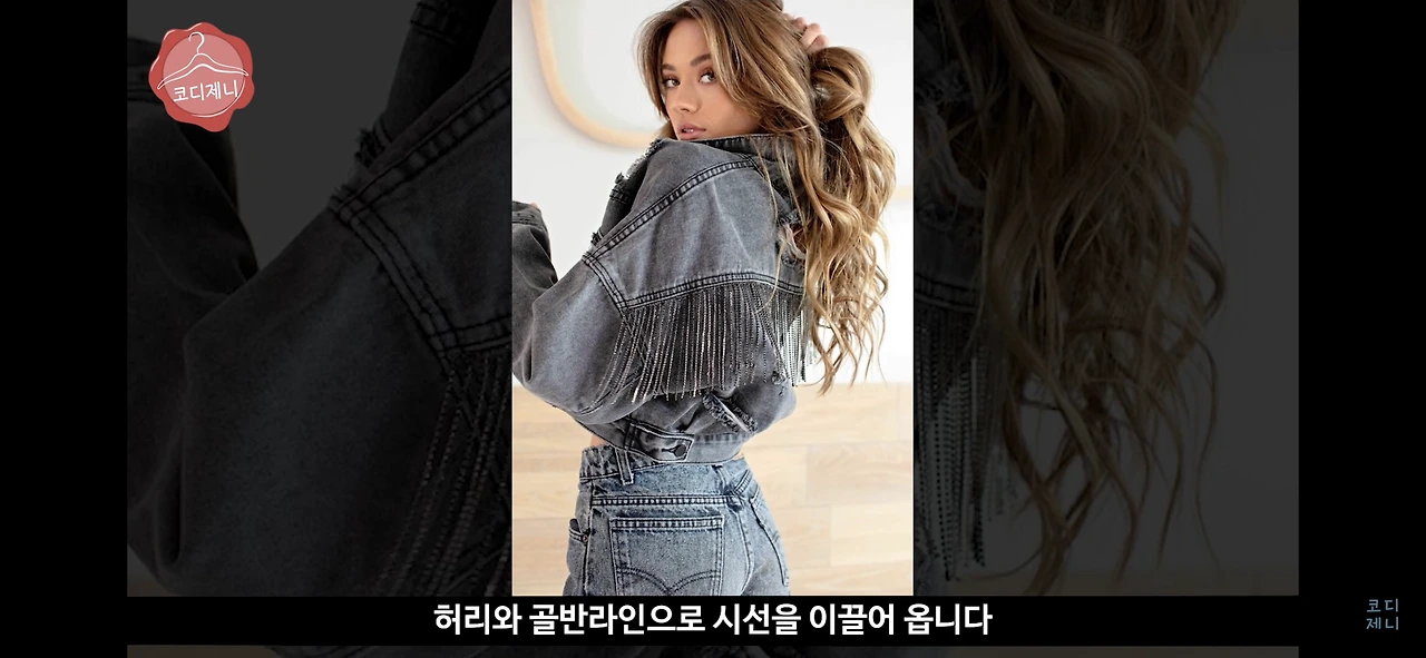 허리 근처에서 끝나는 프린지가 달린 청자켓은 허리와 골반라인으로 시선을 이끌어 옵니다