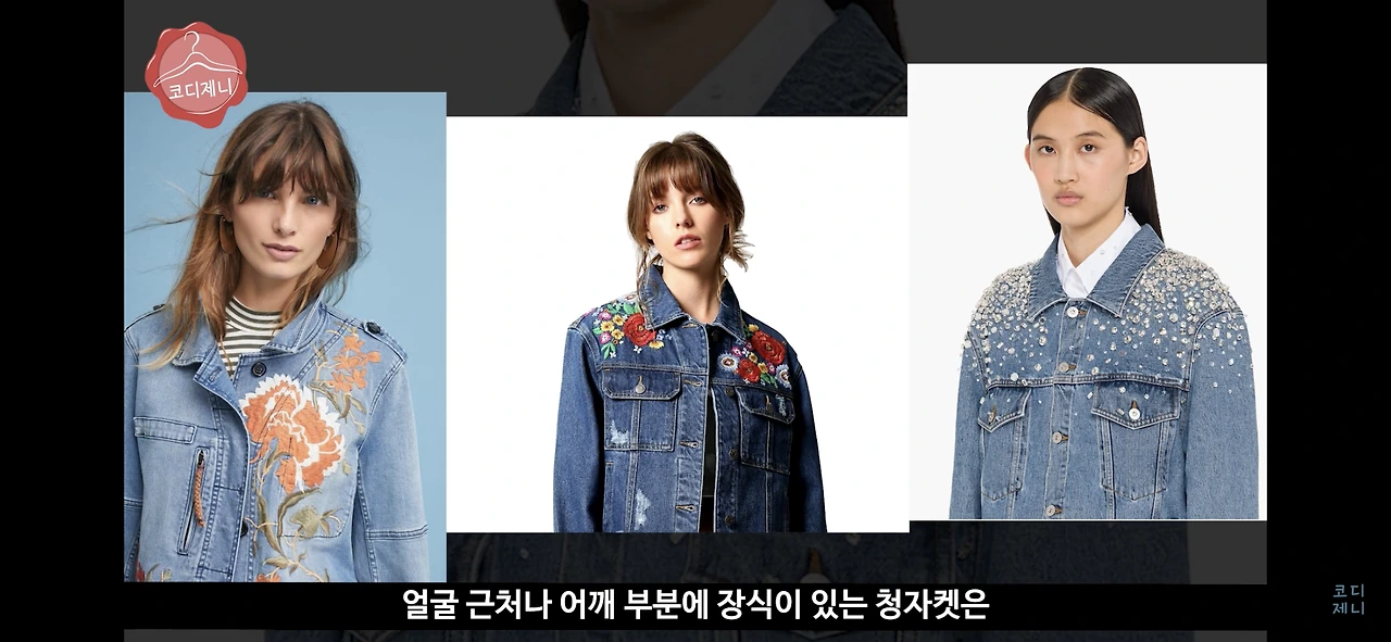 얼굴 근처나 어깨 부분에 장식이 있는 청자켓은 복부에서 시선이 멀어지도록 하고 얼굴이나 쇄골 등 내가 자신 있는 부분에 시선이 갈 수 있도록 도움을 줍니다
