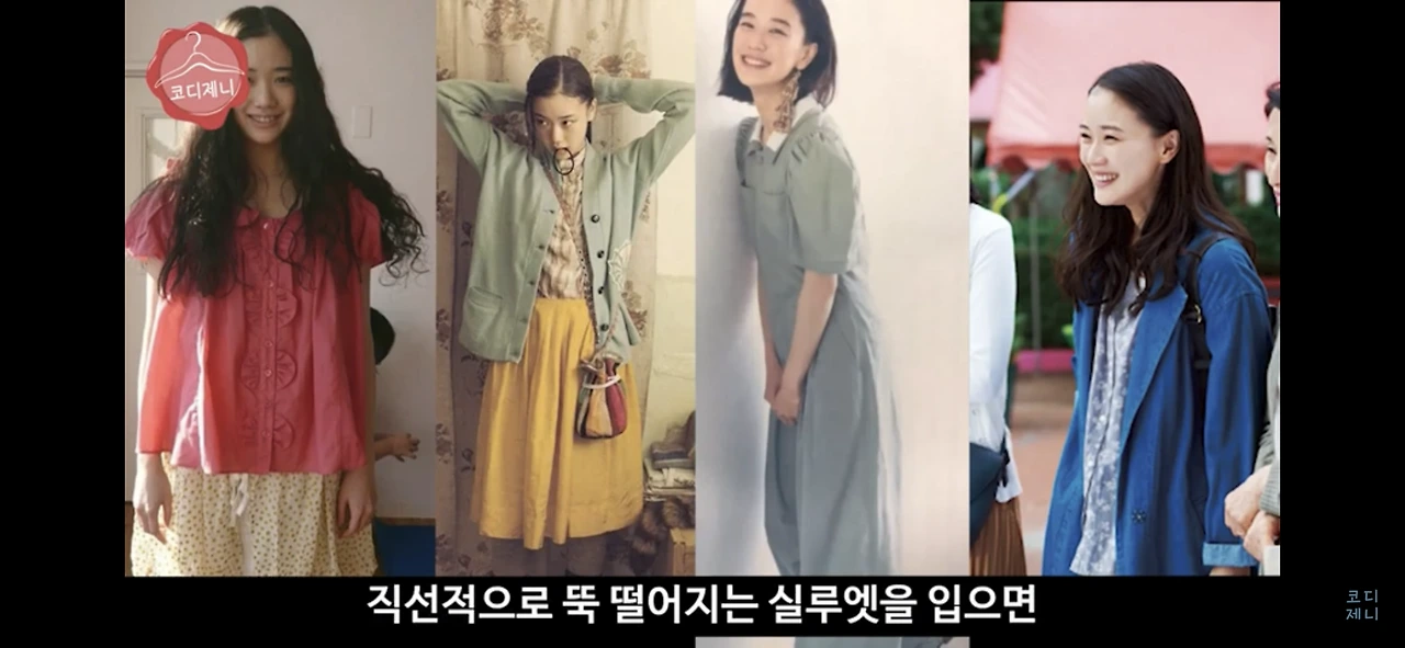 아오이 유우처럼 몸에 굴곡이 많지 않은 일자형 체형은 직선적으로 뚝 떨어지는 실루엣을 입으면 소녀 같은 분위기를 연출할 수 있어요