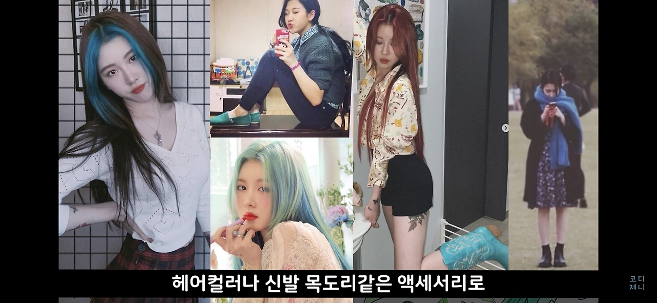 블루나 그린 계열의 헤어 컬러나 신발, 혹은 목도리 같은 액세서리로 컬러 포인트를 주기도 하고,