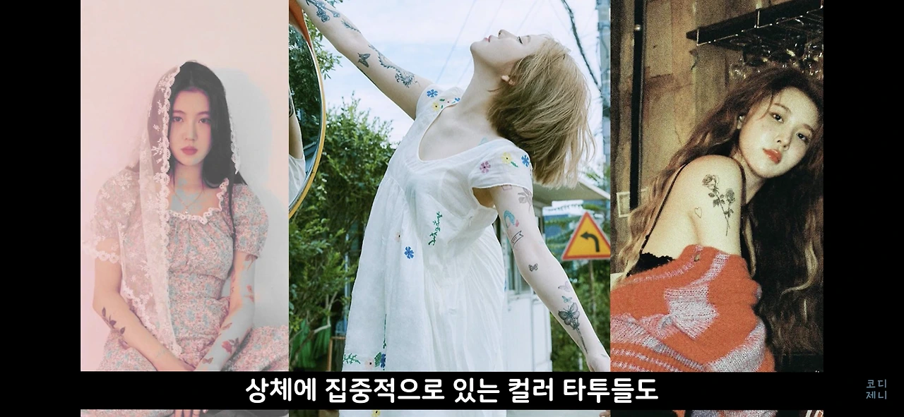 상체에 집중적으로 있는 컬러 타투들도 흰 피부에 강렬하게 대비되는 패턴과 같은 역할을 하고 있어요.