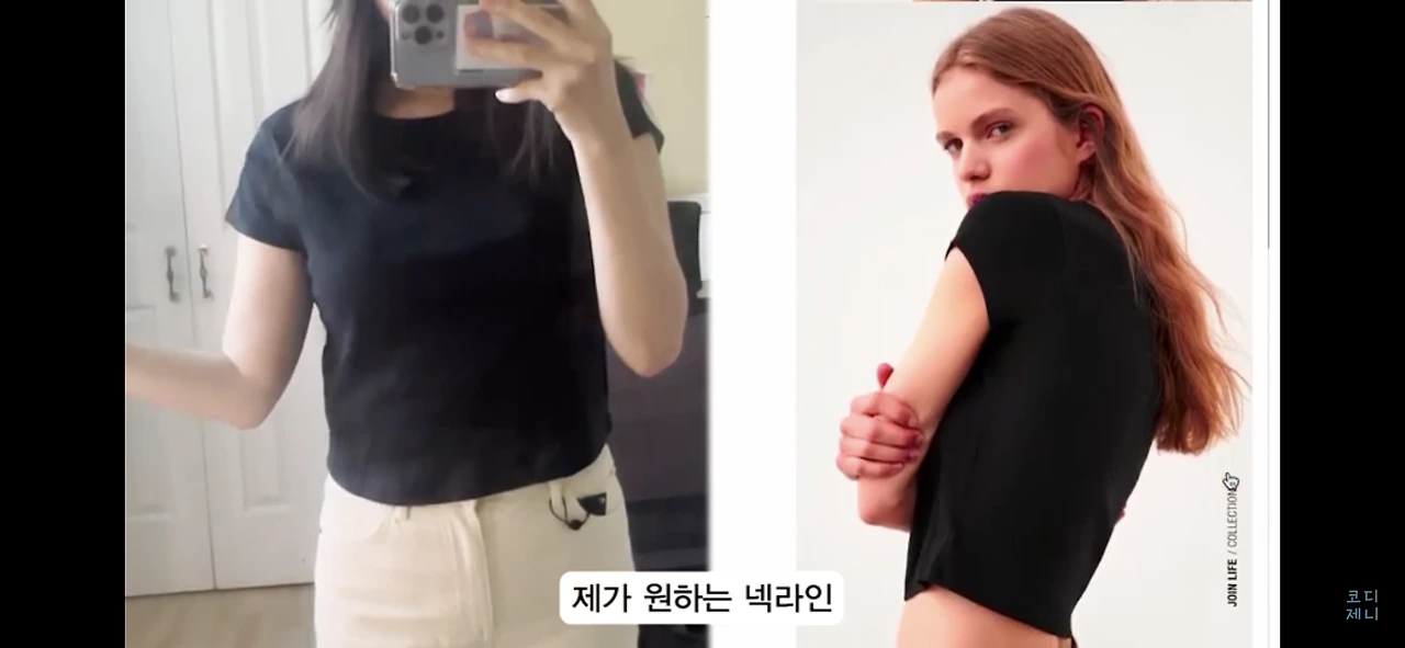 크롭 기장은 부담스러워서 라지 사이즈를 입어봤더니 제가 원하는 넥라인 제가 원하는 넥라인 어깨선 제가 원하는 넥라인 어깨선 기장과 핏감이더라고요
