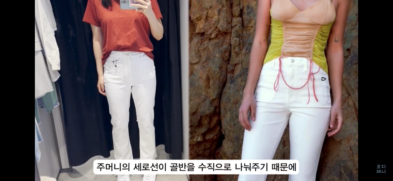 가는 허리와 대비되는 풍성한 골반의 볼륨감이 잘 드러날 수 있고, 주머니의 세로선이 골반을 수직으로 나눠주기 때문에 골반이 비교적 좁으면서 날씬해 보일 수 있기 때문이에요