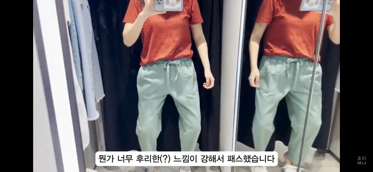 색이 너무 예뻐서 가져왔는데 배기핏이기도 하고, 묶는 끈이 하도 굵고 하고 허리 밴딩도 너무 넓고… 패턴이 잘못만들어진 건지 모양이 좀 틀어지는 거 같기도 하고 뭔가 너무 후리한(?) 느낌이 강해서 패스했습니다