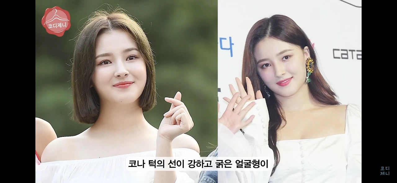 다만 트와이스 정연 님의 경우 하트형이면서도 턱이 짧고 앞으로 살짝 나와 있는 특징이 있기 때문에,