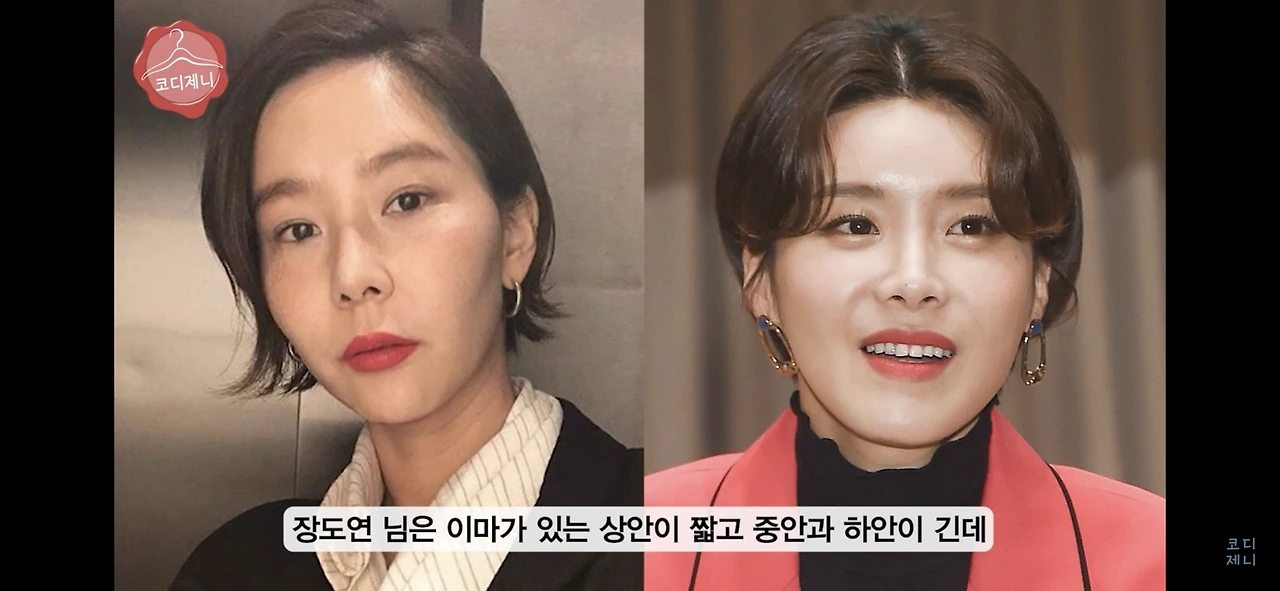 장도연 님은 이마가 있는 상안이 짧고 중안과 하안이 긴데 턱끝이 발달하고 살짝 앞으로 돌출되어 있어요