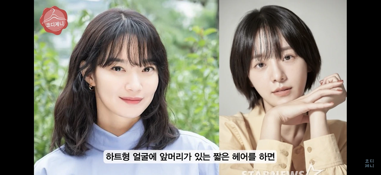 하트형 얼굴에 앞머리가 있는 짧은 헤어를 하면 비교적 넓은 상안의 비율을 줄이면서