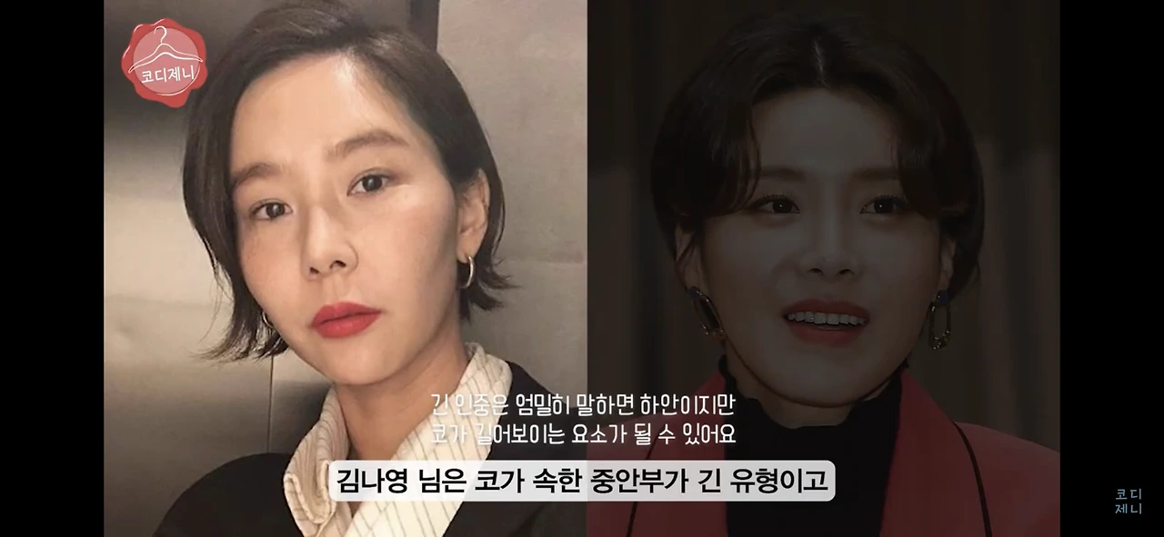 두 분 다 긴 얼굴형 이지만 김나영 님은 코가 속한 중안부와 인중이 긴 유형이고,