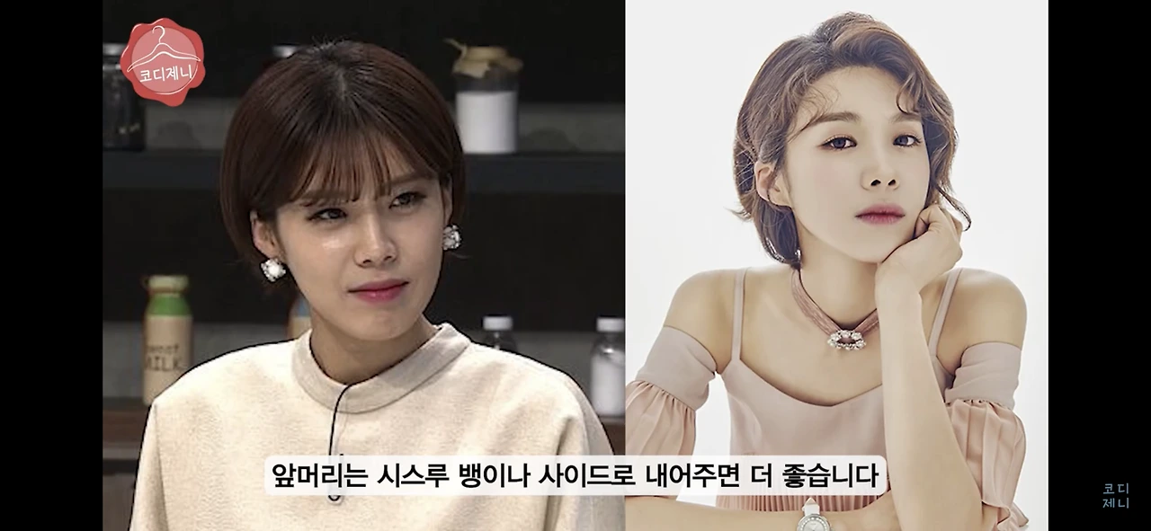 다만 앞머리를 내리거나 사이드에 지나친 볼륨을 주면 얼굴이 옆으로 넓어보이거나 커보일 수 있는 점을 유의하는 것이 좋고요