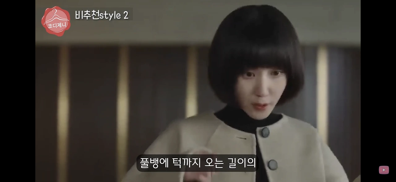 영우 님의 풀뱅 단발이 얼굴의 길이를 부각한다면 상의에 넥라인으로 이를 보완할 수 있습니다