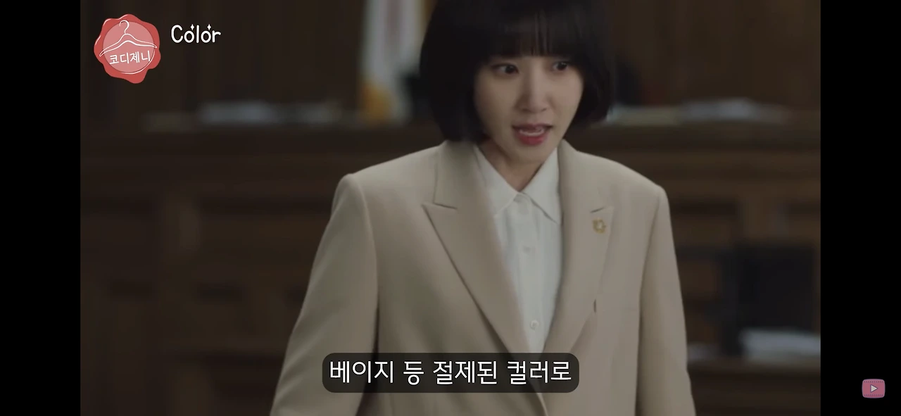 특히 법정 처럼 격식을 갖춰야 하는 곳에서 영우 님은 화이트 블랙 그레이 베이지 등 절제된 컬러로 고급스럽고 프로페셔널한 이미지를 강조합니다