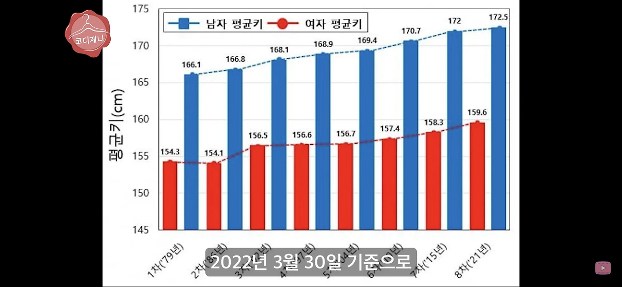2022년 3월 30일 기준으로 국가기술표준원이 발표한 한국여성 평균키가 159.6cm 라고 해요