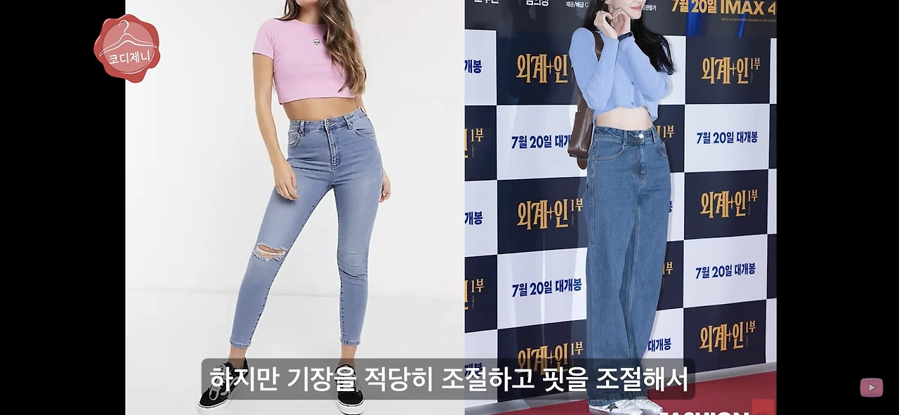 만약 크롭 상의에 짧으면서 타이트한 스키니진을 입으면 약간 작은 옷을 안 맞는데 입은 것 같은 느낌이 났을수도 있어요