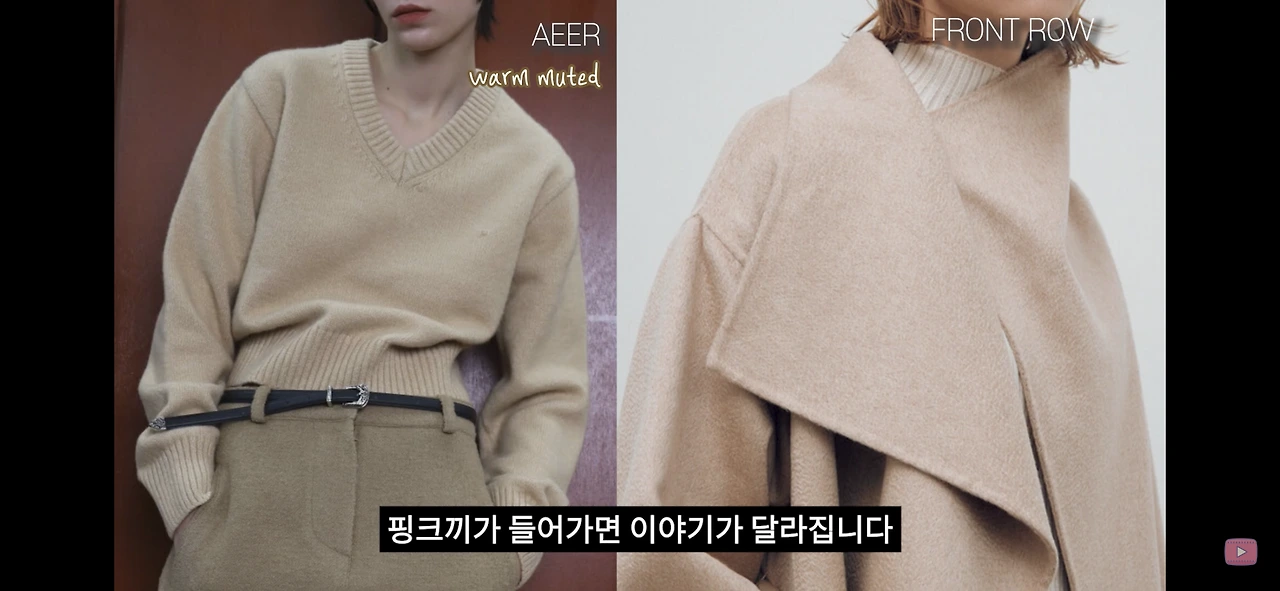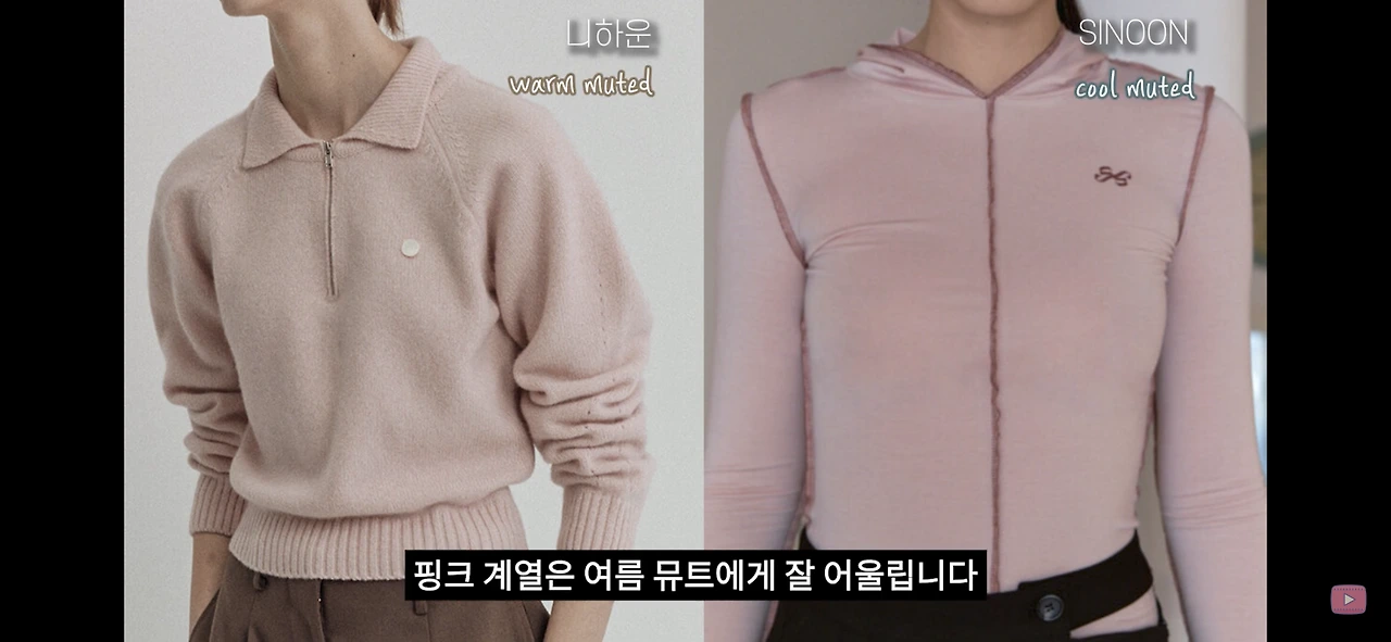 노란기가 있는 살구색계열은 가을 뮤트에게 잘 어울리고 푸른기가 있는 핑크 계열은 여름 뮤트에게 잘 어울립니다