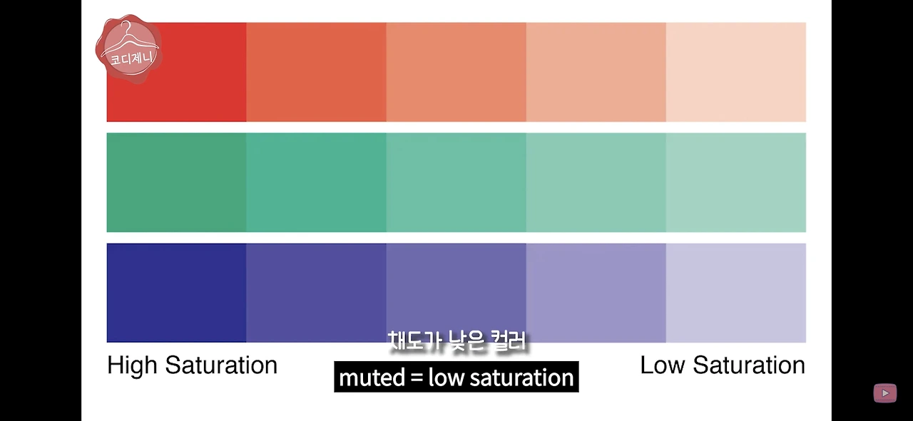원색 계열에 회색(화이트+블랙)이 들어가면 흐릿하고 회끼가 도는 컬러인 뮤트 톤이 되는데,