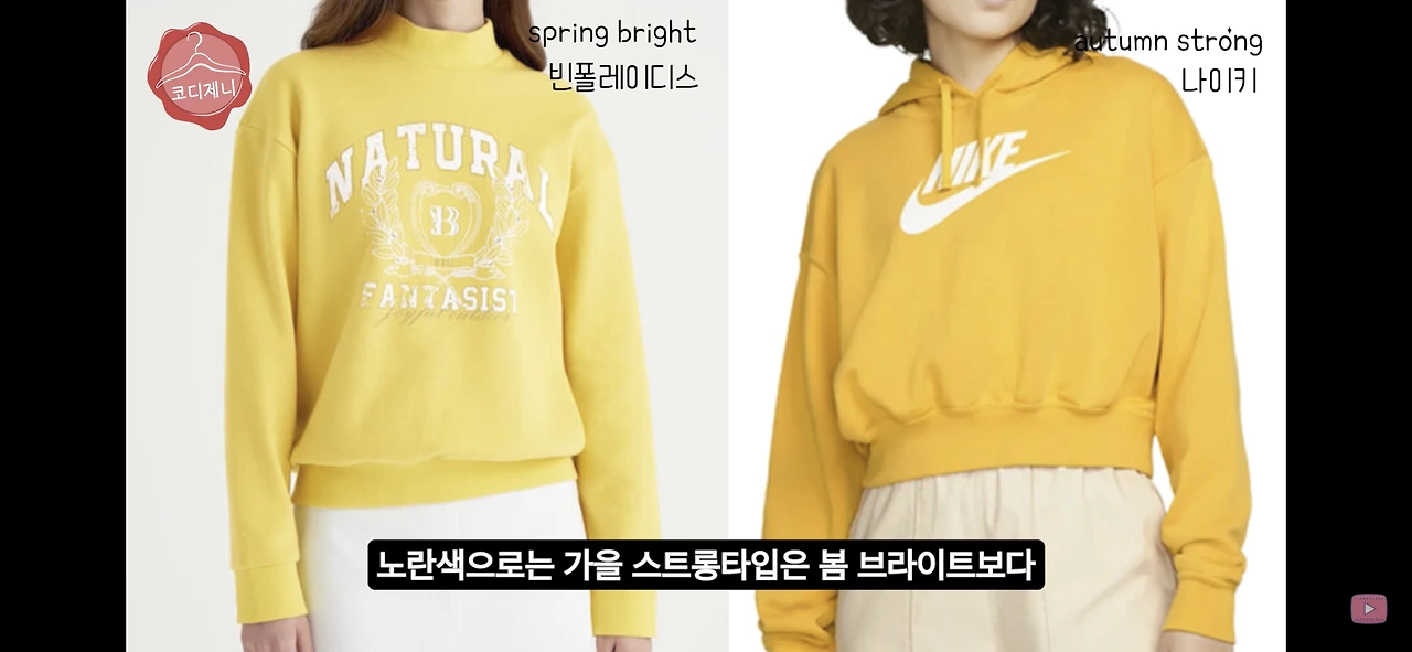 노란색으로는 가을 스트롱타입은 봄 브라이트보다 (봄 브라이트보다) 짙고 쨍한 노란색이 잘 어울리고요