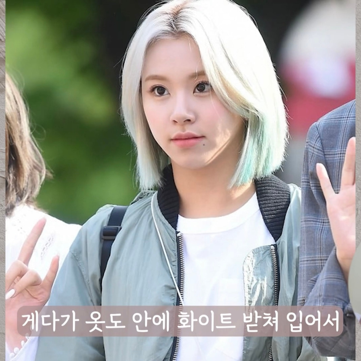 아우터가 채영 님에게 그리 잘 어울리는 컬러는 아니지만 백금발에 가까운 헤어컬러로 대비감을 주고, 이너로 화이트 티셔츠를 입어서 겨울 브라이트에게 잘 어울리는 색깔로 혼합해서 스타일링 했어요.