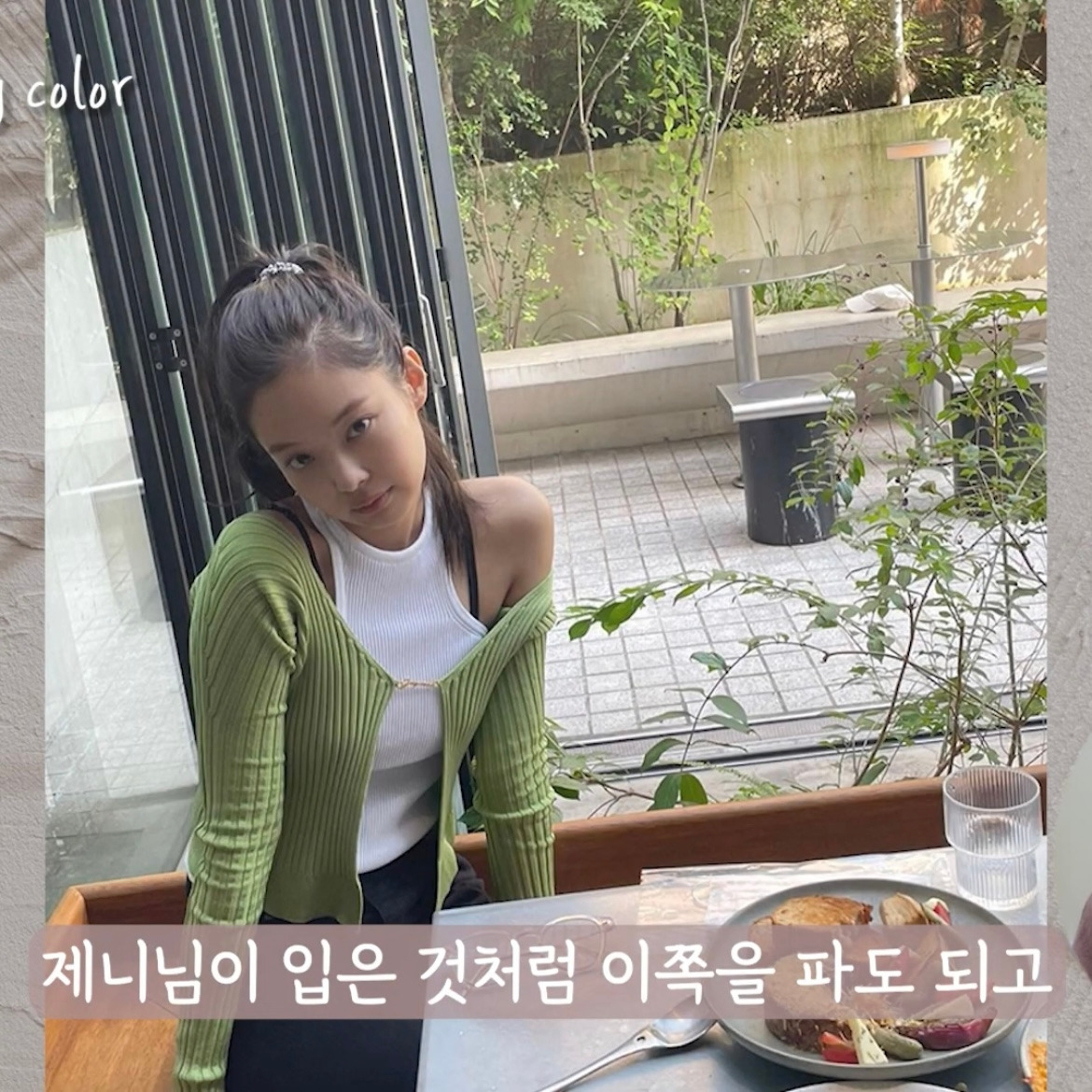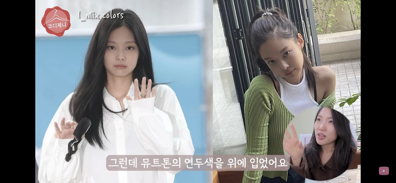제니 님이 그냥 화이트를 입었을 때는 썩 피부톤이 좋아보이진 않아요. 그런데 뮤트톤의 연두색을 위에 입으니 피부톤이 달라 보이네요.