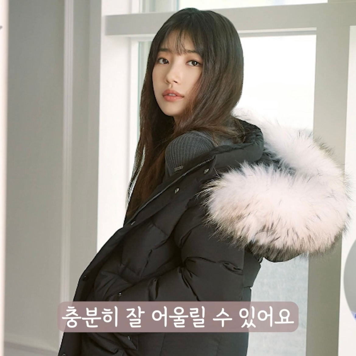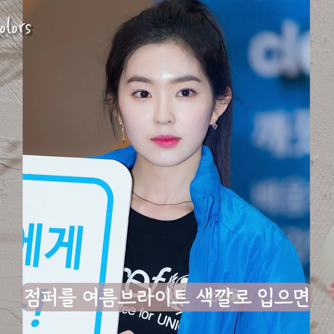 아이린 님도 블랙이 엄청 잘 어울리는 분은 아니지만 로고 색깔이 밝아서 완전 생블랙을 입었을 때 보단 밝아졌고, 점퍼를 여름브라이트에 어울리는 색깔로 입으니까 블랙이 있음에도 불구하고 피부톤이 살아납니다.
