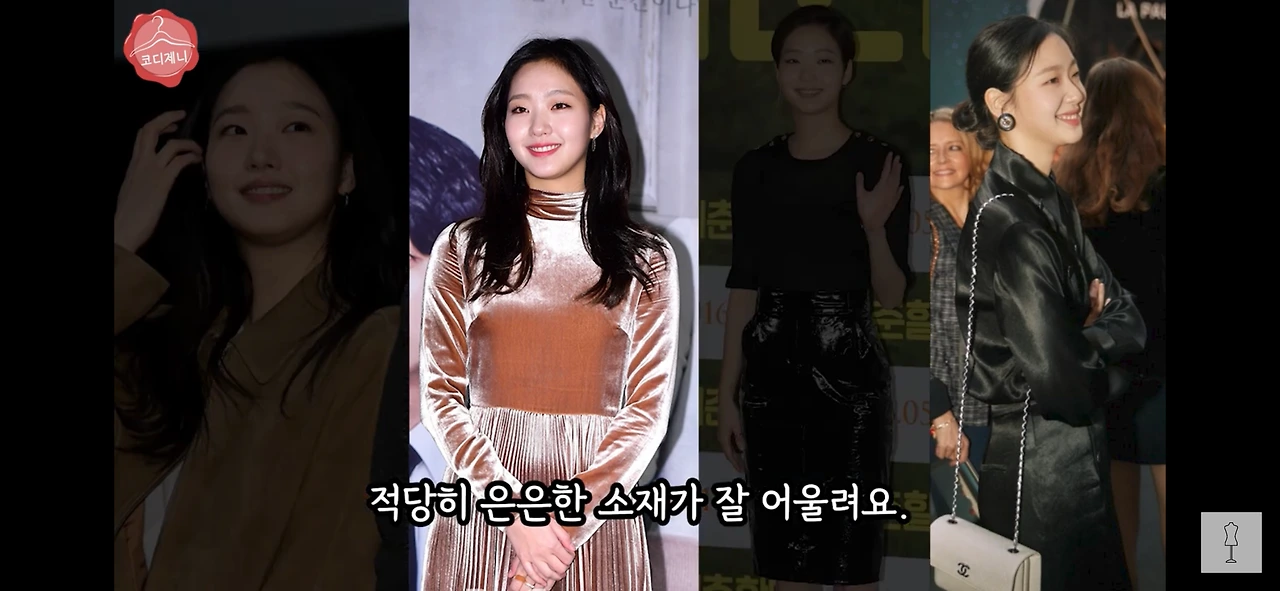 고은 님은 피부에 은은한 광택이 있기 때문에 아예 광택이 없거나 지나치게 번쩍이지 않는 적당히 은은한 소재가 잘 어울려요.