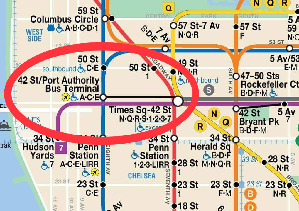 A, C, E 라인 (파랑) - 42nd st / Port Authority Bus Terminal (역에서 내려 도보 5-10분)