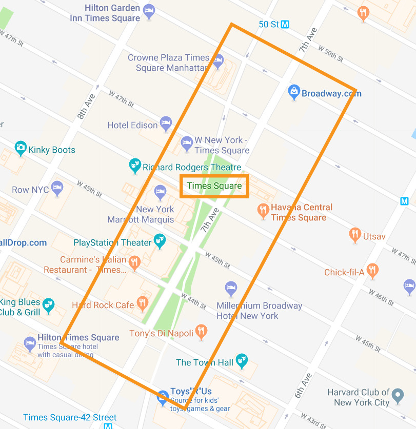타임스퀘어, 굳이 직역을 하자면 시간의 광장이라는 의미를 가지고 있다. 서울 영등포에 있는 백화점 타임스퀘어와는 달리, 뉴욕 타임스퀘어는 수많은 가게들이 밀집해있는 쇼핑과 문화의 '광장' 이라서, 보통 West 42 street부터 West 50 street 사이, 7th ave 와 Broadway ave 에걸쳐있는 지역을 전반적으로 타임스퀘어라고 지칭한다. 여행책자에 나오는 바로 그곳에 가고 싶다면, 46-47 street 으로 직행하면 된다.