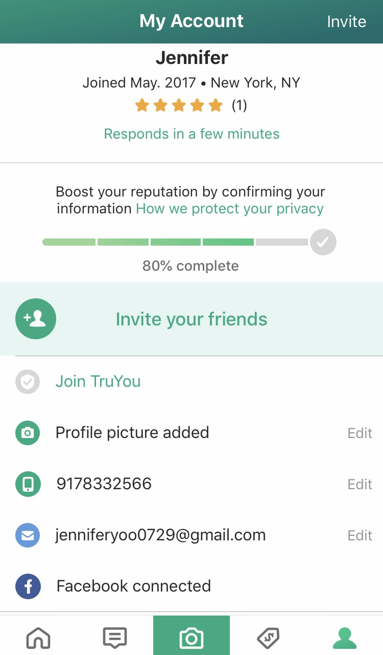 판매자 검증을 하기 위해서는 TruYou 가입하기, 프로필 사진 등록, 전화번호 검증, 이메일 검증, 본인 이름으로 된 페이스북이나 sns 검증하기 가 있는데 모두 등록하면 100% 검증된 셀러가 된다.