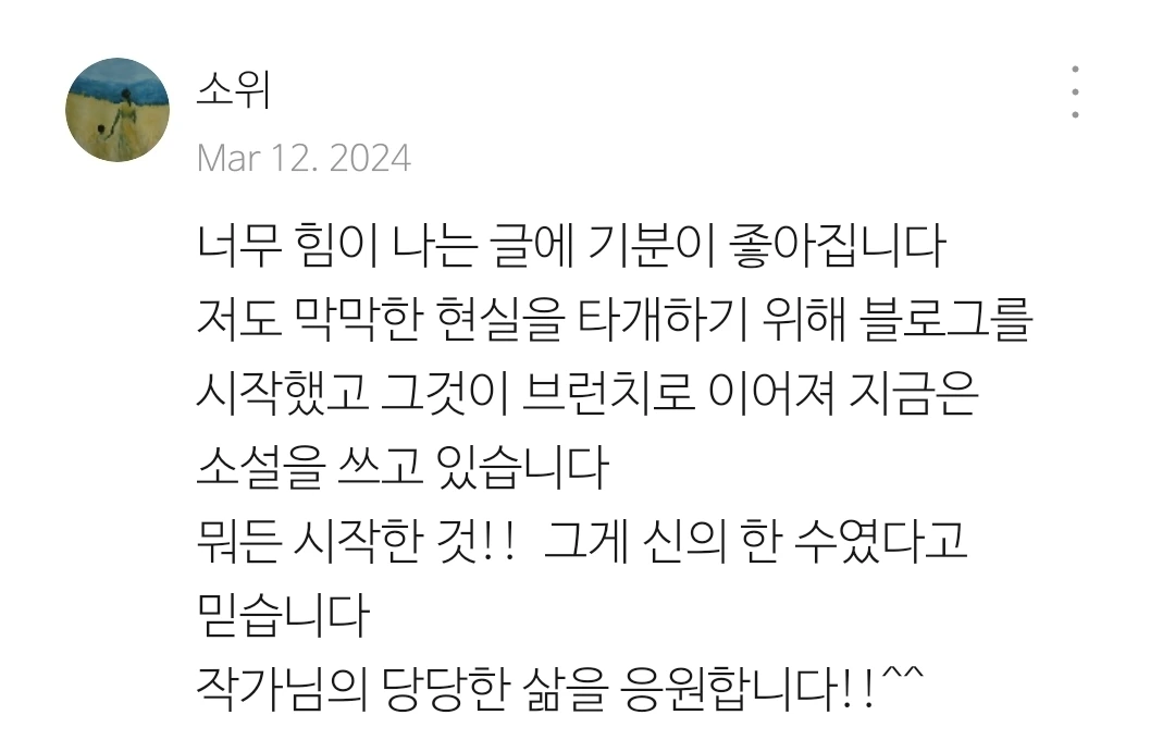 아무도 궁금하지 않을 내 이야기로 위안 삼을 사람이 있겠지? 그 위안으로 다시 삶을 도전하는 사람이 있을 거야 . 스스로를 다독이며 인생 스토리를 쓰는 사람.