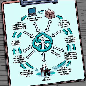 “할 일은 많은데, 일이 손에 안 잡힌다' -> 스트레스가 쌓였다. '큰일 났다, 이러면 안 되는데, 망하는데..' 등등 -> '스트레스가 쌓이니 마음이 안 좋아서 더 일할 상태에서 멀어진다 - 일을 하려면 머리 에너지도 마음 에너지도 어느 정도 있어야 되는데, 내 스트레스가 내 정신 에너지를 더 고갈시킨다' -> 더 스트레스받는다. -> 할 일은 많고, 데드라인은 더 가까워져 오는데, 나는 더 위기 상황에 빠진 느낌이 든다.” 그리고 또 도돌이표.