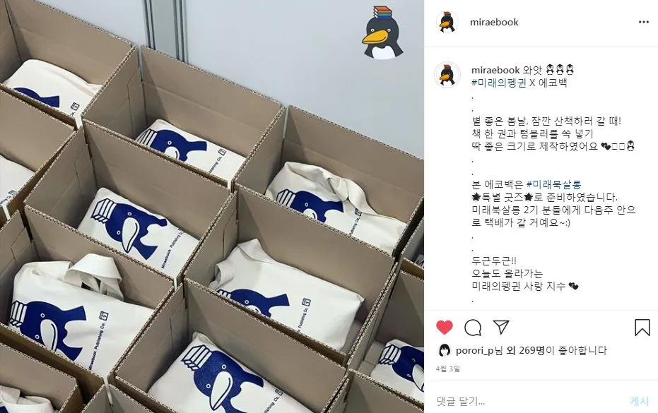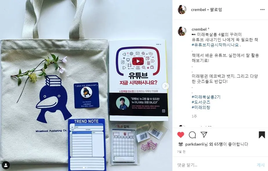 3월에 드린 첫 책은 <질병이 바꾼 세계의 역사> 였습니다. 발대식 첫 만남에서 직접 뵙고 첫 책과 굿즈를 드리면 좋았겠지만, 아쉽게도 코로나19로 3월 중순 예정이던 발대식과 모임은 미루게 되었습니다. 오프 모임을 갖지 못해 아쉬우셨을텐데 미래북살롱 분들께서 주로 활동하시는 개인 SNS 유튜브, 페이스북, 인스타그램에 도서 후기와 북살롱 활동을 널리 공유해 주셨어요. 4월에 전해 드린 두번 째 책 <유튜브 지금 시작하시나요?> 와 ★특별 굿즈★ 미래의펭귄 에코백 후기와 함께요! ><