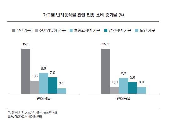 1인 가구 비중이 전체 가구의 30%에 육박하면서 ‘나 홀로 욜로YOLO: You Only Live Once’라는 의미의 ‘홀로족’이 부상하고 있다. 이들은 사람들과의 관계에서 벗어나 나만의 인생을 즐기는 사람들로서 혼자 즐길거리와 반려동식물에 관심을 가지고 있다. 이들의 주요 키워드로는 #혼술 #집사스타그램 #반려식물 #반려동물 등이 있다. 가구별 반려동식물 관련 업종의 카드 소비액을 분석한 결과 1인 가구에서 반려동식물에 대한 소비가 전년 동기 대비 19.3% 늘어났으며, 이는 다른 가구에 비해 10% 이상 높은 증가율을 보인 것이다. 절대적인 금액 기준으로는 1인 가구가 반려동식물 시장에서 차지하는 비중이 8.2%로 작지만, 앞서 나타난 매출 증가율을 무시해서는 안 될 것이다. 당장 1인 가구에 어울릴 만한 상품 개발을 시작해야 하지 않을까?