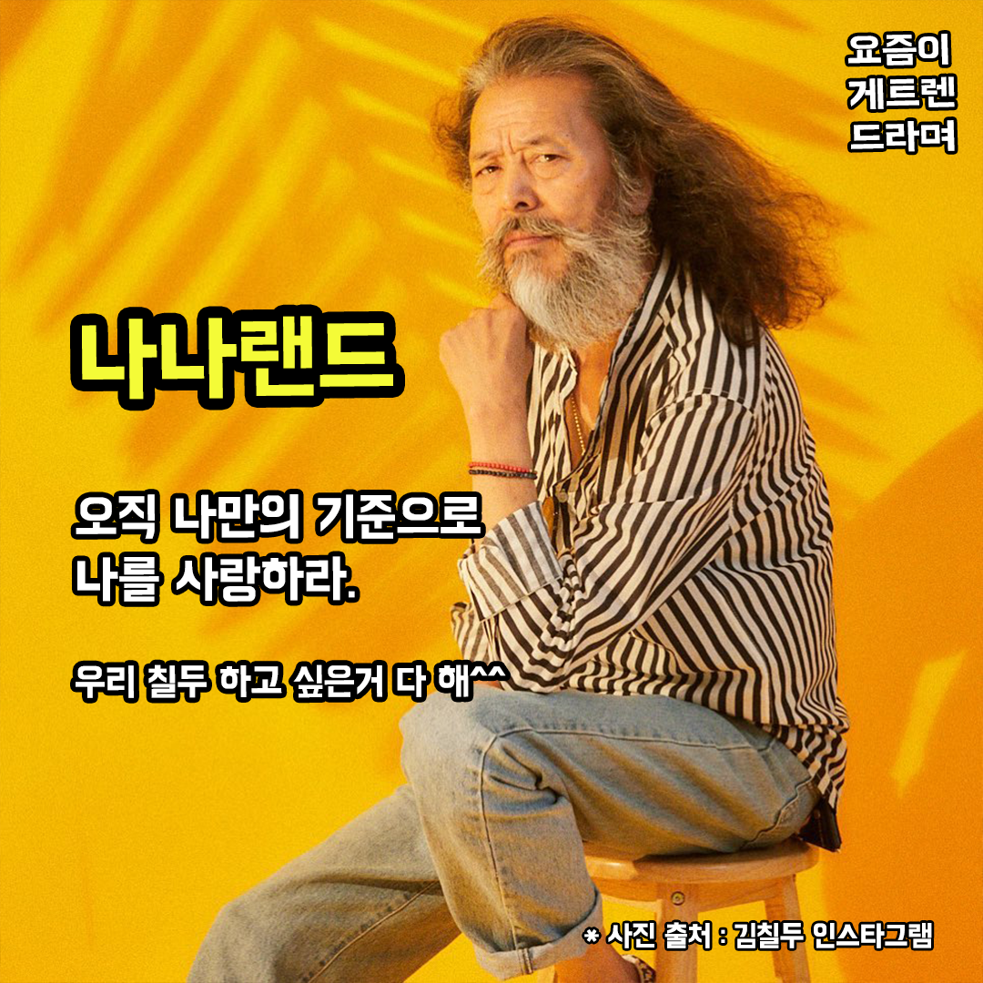 여러분, 요즘 대세 모델, 김칠두 씨를 아시나요? 올해 63세 김칠두 씨는 모델이 되기 전 순댓국 사업에 실패한 가장이었는데요. 젊은 시절 모델의 꿈에 도전하는 그가 꿈꾸는 새로운 목표는 국내 시니어 모델 최초로 세계 4대 패션 위크에 진출하는 것인데요. 역시 나나랜더 시니어 모델답게 더 이상 나이도, 스펙도, 타인의 시선은 중요하지 않은 것 같습니다! 나를 위한 삶을 추구하는 사람들의 땅, 나나랜드 좋은 변화겠죠?