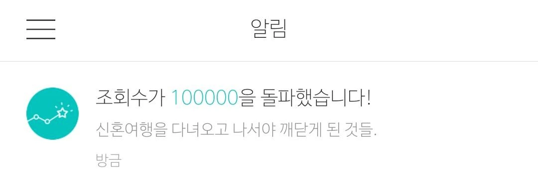 얼마 뒤에 다시 알림 글이 떴다. 0의 숫자를 세어보았다. 시력이 좋지 않아서 잘못 보였을 것이라 생각하였는데, 아무리 세어보아도 10만을 넘었다. "오빠, 내 글이 조회수가 10만이 넘었어!" 신기했다. 하늘을 나는 기분이었다. 어떤 포인트가 많은 공감대를 샀는지 궁금하기도 했고, 왠지 그 날은 그 느낌을 즐기고 싶다는 생각이 더 크게 들었다.