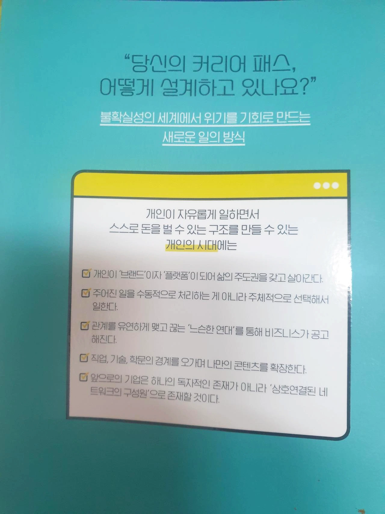 책을 읽다 보면 은연중에 가지고 있던 교만이 조금씩 허물게 된다. 그리고 내가 앞으로 나아가야 할 방향성에 대해 아주 친절하게 안내받을 수 있다. <개인의 시대가 온다> 책도 마찬가지였다. '1인 기업'이 담고 있는 여러 가지 작은 가지들(예 : 온라인 플랫폼, 스마트 스토어, 텀블벅 등)에 대한 구체적인 상황과 실행 방법을 마치 온라인 강연을 듣듯이 친절하게 작가는 한 장 한 장에서 안내해주고 있었다.