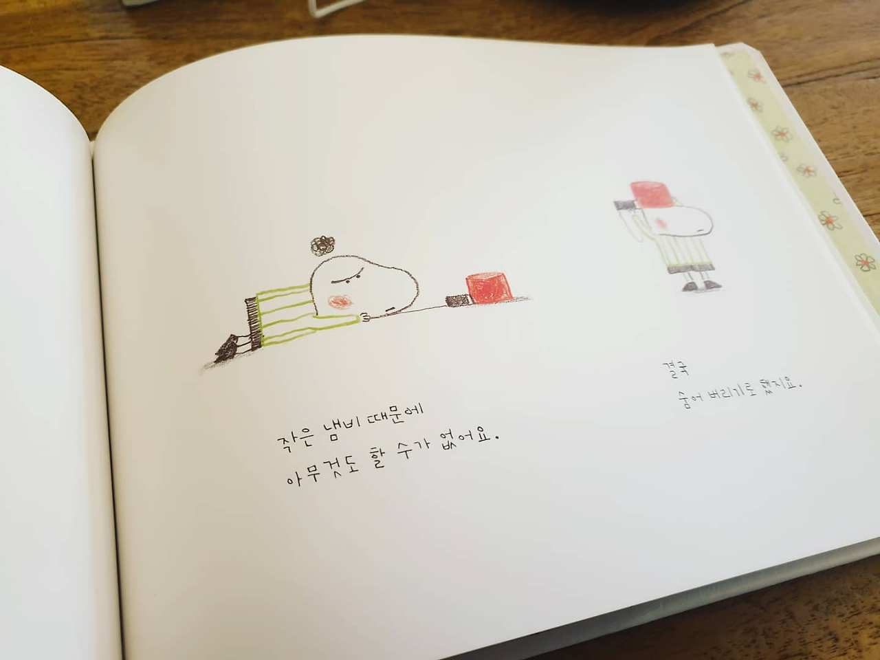 <아나톨의 작은 냄비> 속에 등장하는 또 다른 주인공은 아나톨이 냄비를 넣고 다닐 수 있는 예쁜 주머니를 만들어준다. 그리고 그 안에서 아나톨은 자신이 잘할 수 있는 것을 발견해간다. 비록 여전히 삶이 순탄할 것 같지는 않다는 느낌을 받았지만. 적어도 자신의 냄비를 숨기려고 애쓰지 않는다.